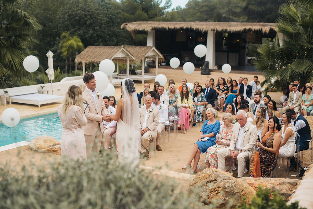 Beautiful, bold and utterly stylish in a tropical, bali esc inspired setting for Harry and Sam. A cool, quirky and laid back, garden party turned banquet style dinner with whicker place settings that matched the raw, bohemian style vibe of this Ibizan hot spot and trendy style elements of the bride and groom - including the Sam's statement bridal shoes!